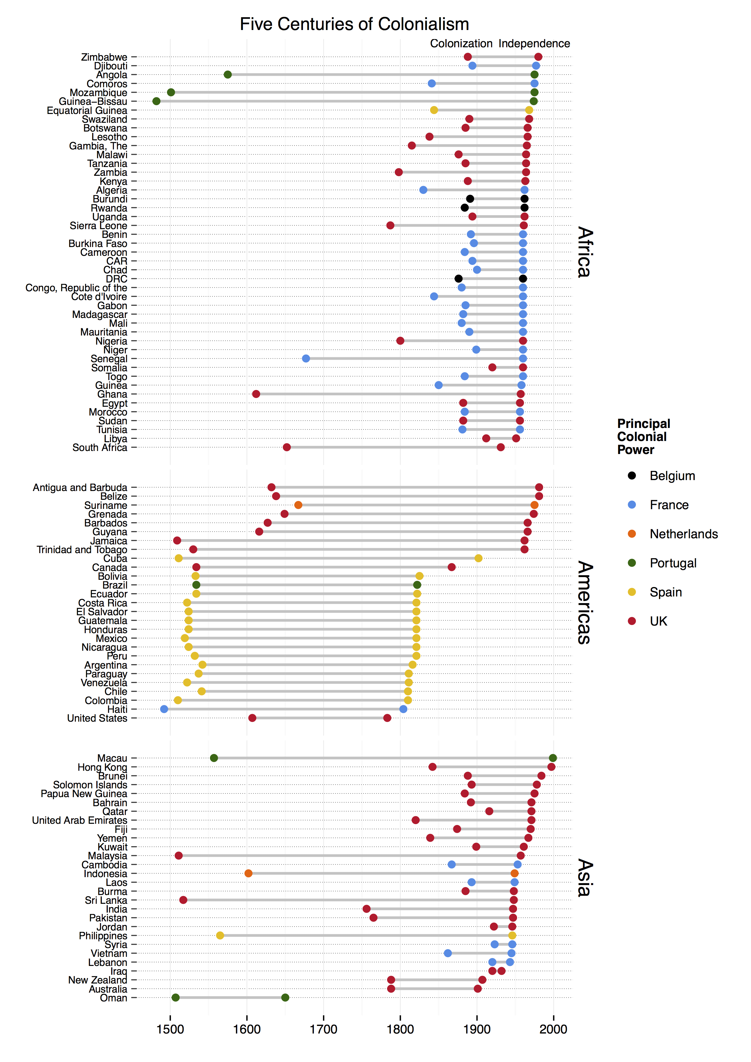 To reduce complexity to a manageable level, I set some limitations on what countries to include. First, the chart shows only those countries victim to Western European colonialism. I don’t include Ottoman, Japanese, Russian, American, or other colonial empires. I also don’t include territories that are still governed by former colonial powers (e.g. Gibraltar). This gets controversial and complicated. Countries that were uninhabited upon discovery by colonial powers are also not included. The same with countries that later gained independence from a post-colonial state (e.g. South Sudan).